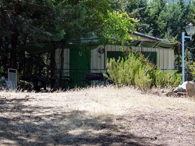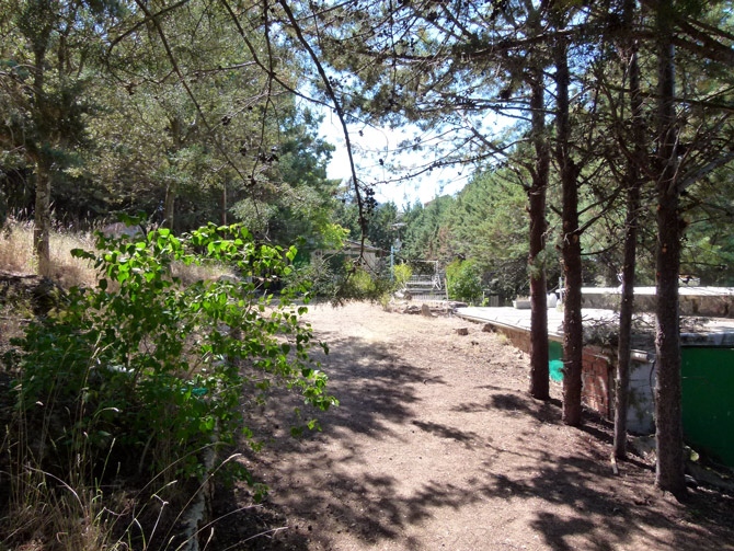 A diferencia de la de sus vecinos, impoluta, la otra parcela se observa que no es habitada con frecuencia. Cuenta con una casa prefabricada con las persianas bajadas, un garaje de piedra y otra construcción sobre la que se asienta una terraza, aparte de la piscina. A un lado, tras una pendiente, el arroyo Horcajo.