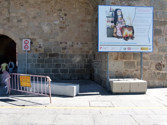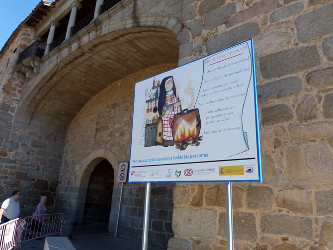 De los nueve carteles a instalar en cada puerta de la muralla, éste es el segundo, que estará colocado hasta el 22 de julio. El primero -ya se ha retirado- se instaló en el arco del puente Adaja y estuvo dedicado a eliminar el lenguaje despectivo hacia las discapacidades.