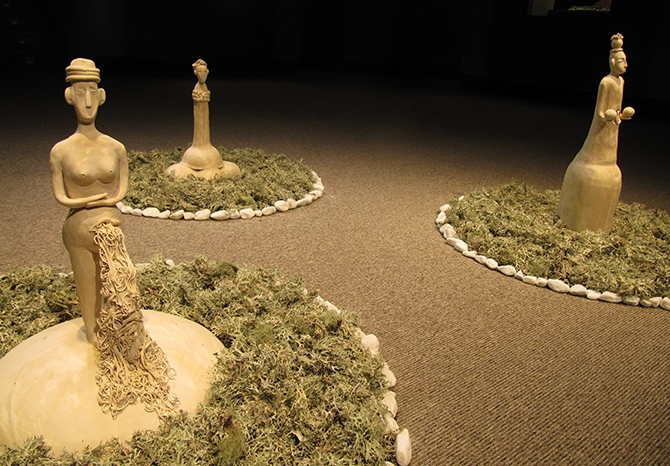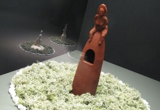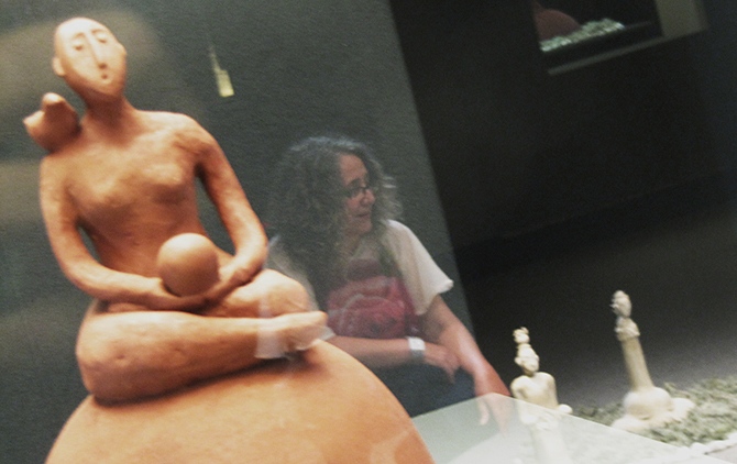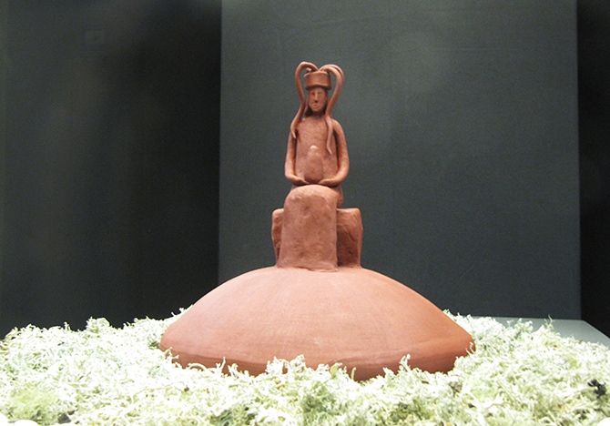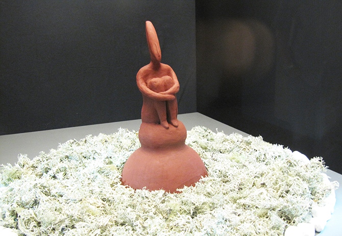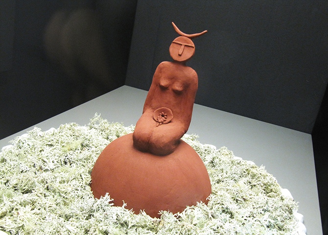 Ocho piezas de barro rojo, que representan a “la tierra como madre creadora” se encuentran en las vitrinas de la sala Vettonia, mientras que en el centro de la sala en el suelo, tres figuras en barro blanco presiden la muestra, en la que piedras, tierra y vegetales complementan la cerámica.