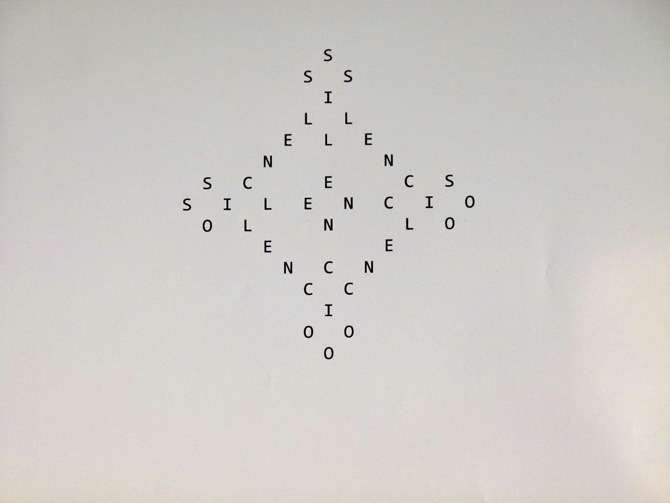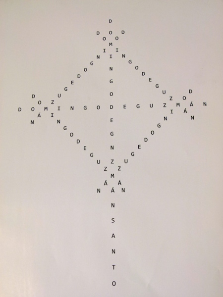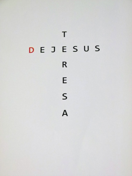 Los scaligramas o escaleras-poema son la antesala a la exposición 'Silencio mayor', donde en el claustro cuelgan 32 poemas-planos visuales, ocho en cada galería, que denomina sacrogramas, también dedicado a Santa Teresa.