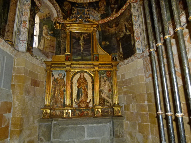 Los trabajos de restauración de la iglesia, tras diez meses, han concluido. En este tiempo se han descubierto en la capilla de San Jerónimo, en el ábside sur, parte de unas pinturas murales -datadas a comienzos del siglo XVI- que se ocultaban tras el retablo del siglo XVII, que ha sido trasladado de lugar al brazo del lado de la Epístola del crucero. El altar de granito que allí estaba ha quedado adosado a la pared, ya que por su forma curva los restauradores creen que fue su lugar original y que data del mismo momento que la decoración pintada.