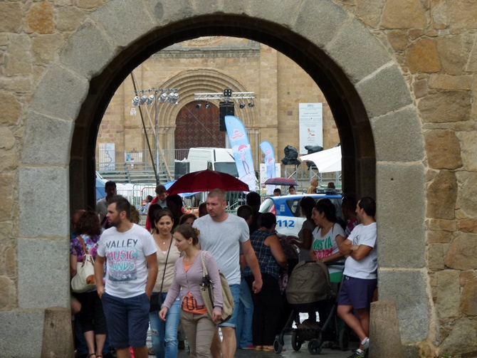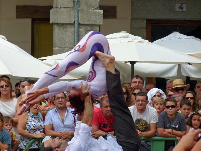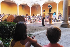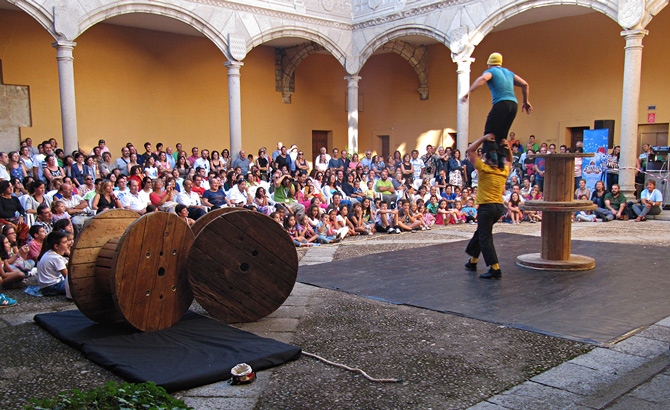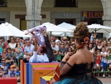 La lluvia que cayó al mediodía no impidió que de nuevo cientos de personas rodeasen los espectáculos, hicieran cola ante las carpas y barracas, y llenasen los palacios, como el de Bracamonte, que acogió el montaje 'Ekilibuá', de acrobacias y equilibrios en torno a unas bobinas de madera.