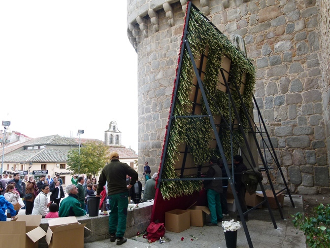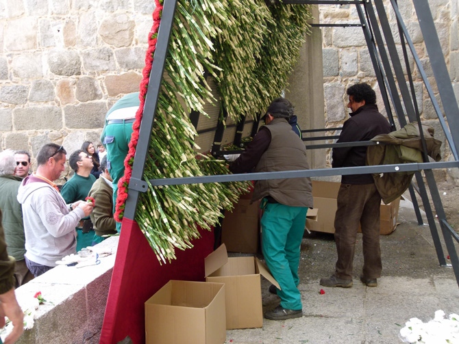 Comenzó al mediodía del lunes y, tras finalizar, los 20 operarios del Servicio de Jardines concluyeron la colocación de los claveles: entonces se pudieron apreciar dos imágenes de La Santa, el logotipo del centenario y el de la ruta 'Huellas de Teresa', las fechas del centenario, el escudo de la ciudad y, abajo, la muralla..