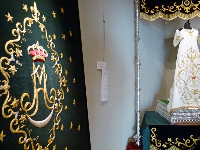 Un manto de terciopelo verde bordado en oro, que data de 1954, es la pieza más llamativa de la exposición, con el que salió en procesión de la Virgen de la Esperanza hasta 2012. Es uno con los que cuenta en diferentes tonos de verde, que se suma a otros en morado negro y azul, aunque en la actualidad se prepara uno nuevo y más grande.