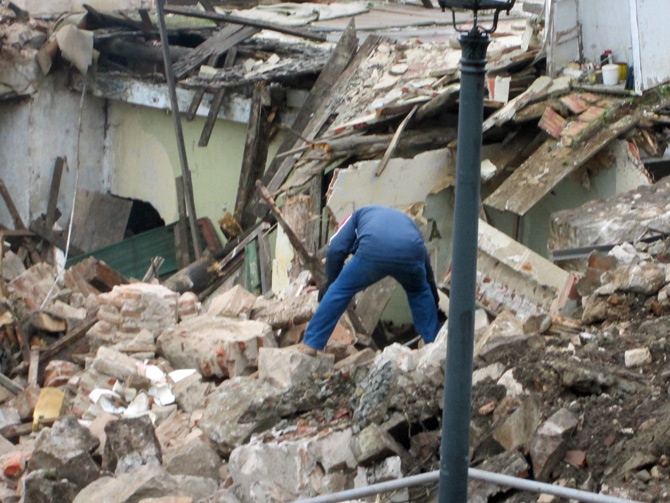 Antes de reanudarse el derribo, las dos personas que se habían introducido en los escombros, ya fuera, reclamaban llevarse la bañera ante la negativa policial. La siguiente escena fue la un operario cargando la bañera e introduciéndola de nuevo entre los escombros.