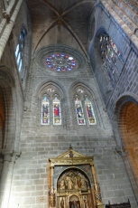 De finales del siglo XV y comienzos del XVI, las vidrieras se encuentran en dos grandes ventanas góticas con tracería, obra del maestro burgalés Juan de Valdivieso, realizadas probablemente entre 1497 y 1500, y que sufrían deformaciones, movimientos, desprendimientos y desplomes del panel inferior de la lanceta izquierda de una de ellas, como consecuencia del fuerte viento que debilitó sus paneles en 2006.