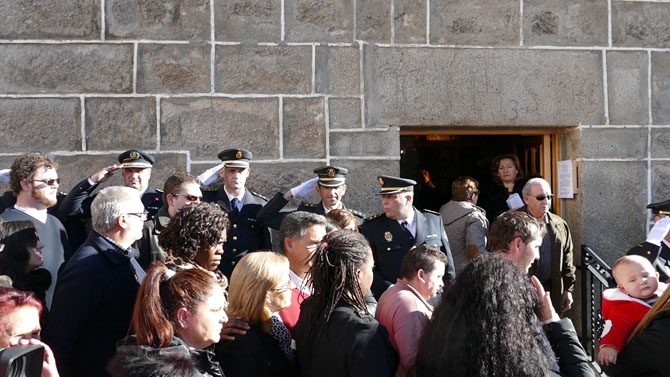 Una veintena de agentes de la guardia de honor del Cuerpo Nacional de Policía de Ávila y varios efectivos de la Guardia Civil formaron ante la iglesia, antes de que seis agentes le trasladasen a hombros al cementerio.