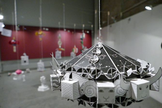 La exposición 'Recortaqué' es un pequeño bosque, con sus elfos, cíclopes u hongos, donde aparece Charlot, Einstein explicando en una pizarra la teoría de la relatividad y los hermanos Marx. Y entre medias, la Alhambra de Granada, o los 'Tintonelos' o el cuento de Bela&Nical, para concluir con piezas más grandes similares a unas naves espaciales o a animales prehistóricos.