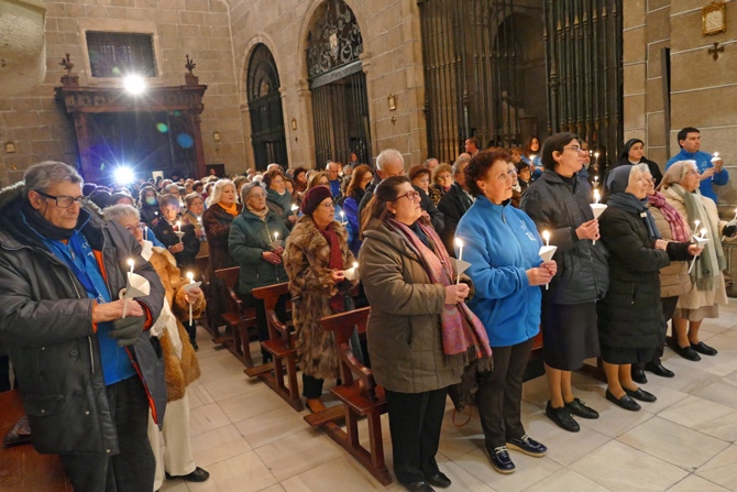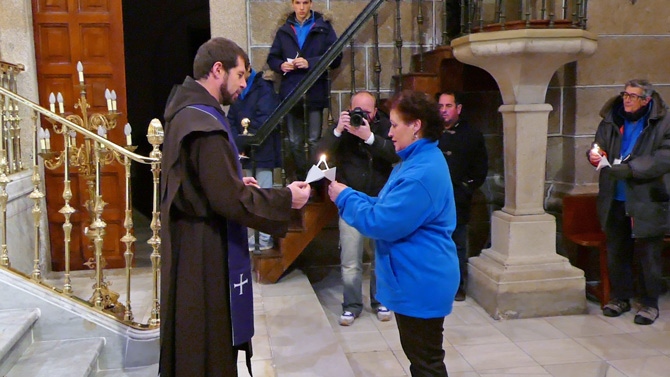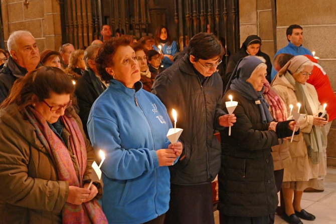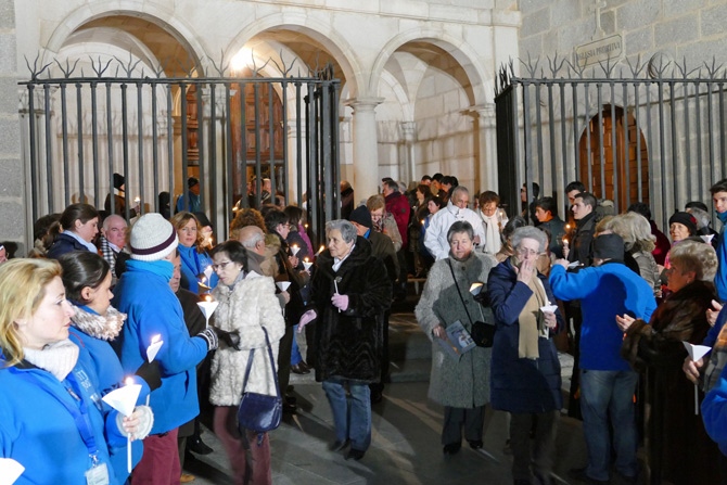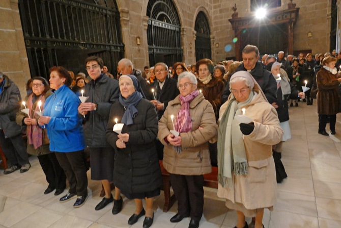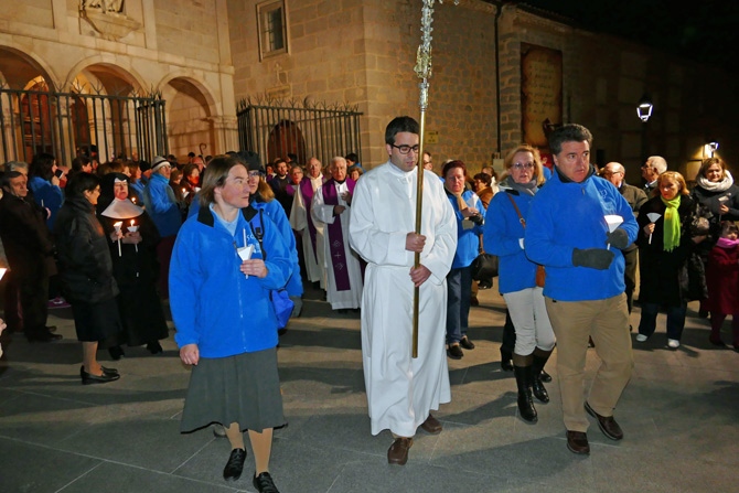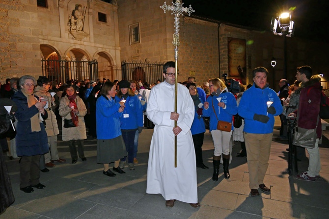 El obispo, Jesús García Burillo, que hizo una oración ante la cruz y leyó el pasaje de las tentaciones de Cristo en el Convento de San José, ha presidido la comitiva que con los participantes portando pequeñas velas han acudido hasta San Pedro.