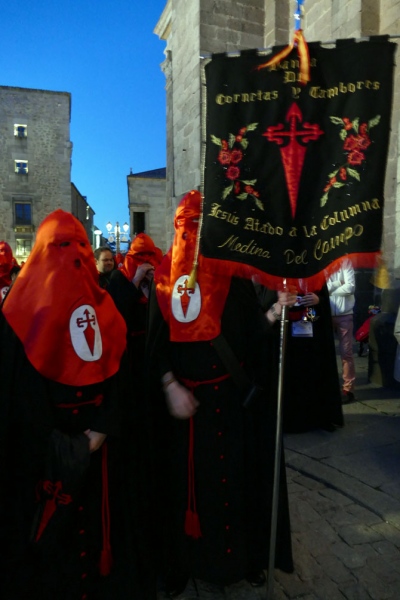 Inconfundibles, los penitentes, con túnica morada, capa de color oro, y capucho morado, varios cientos de hermanos acompañaron al desfile, que contó con la Banda Juvenil de El Amarrado; el sonido de gaitas de la Banda de Cornetas y Tambores de la Oración en el Huerto, de Medina del Campo; y la Banda del Cristo Amarrado a la Columna, también medinense.