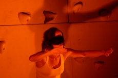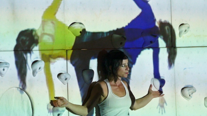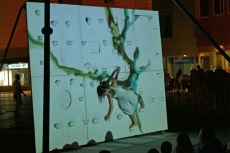 Suspendido a seis metros de altura, toca el piano y las percusiones, y canta, y en directo desgrana un concierto a modo de banda sonora. Humor y poesía, como Nadine O´Garra con su danza vertical con posiciones imposibles sobre una pared en la que las imágenes proyectadas dan como resultado su visión del mundo actual en 'Amor en tiempos de Ikea'.