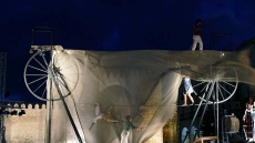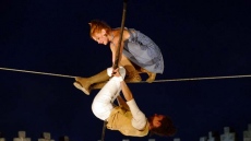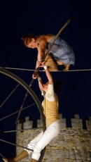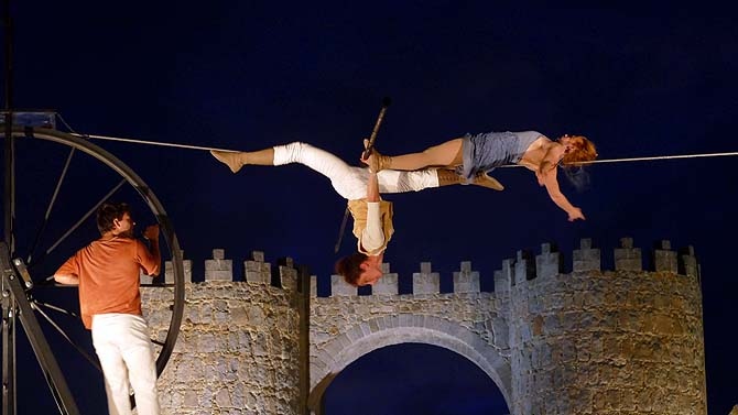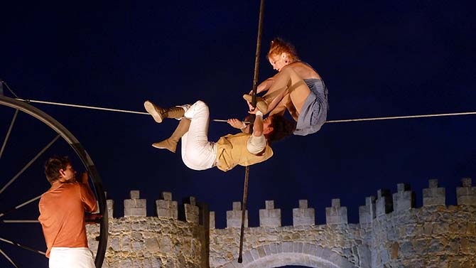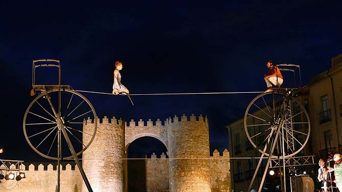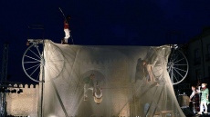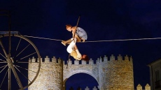 A pesar del viento, los integrantes de la compañía francesa -que tuvo suspenderlo el sábado por problemas técnicos- pusieron en escena 'Sodade', una fábula de la vida con equilibrios y juegos, y posturas y bailes imposibles sobre el cable, además de música en directo con violonchelo y cantante.