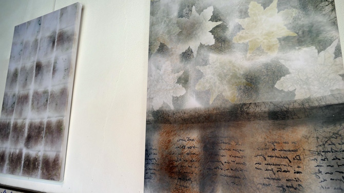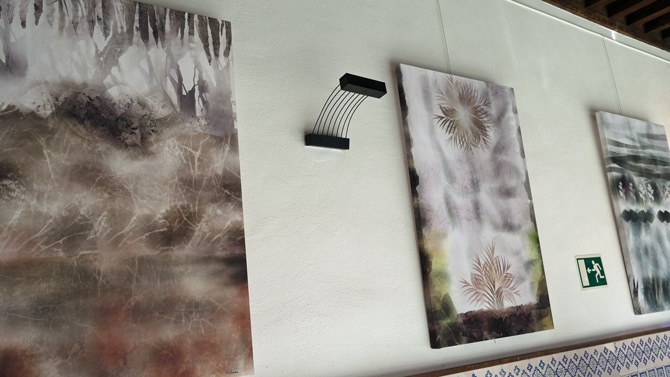 La naturaleza protagoniza la obra de ‘Tucha’ (Madrid, 1967), que se puede ver, con el título de ‘Herbario’, en el claustro y en la sala central del Torreón de los Guzmanes y en la que la propia artista elabora los pigmentos empleados en sus pinturas textiles con tinte industrial que mezcla con otros productos para aplicarlos como si fueran acuarelas. Esto da como resultado cuadros que aparentan ser impresiones sobre el raso que utiliza como lienzo.
