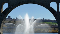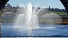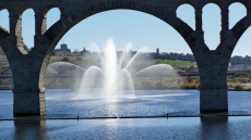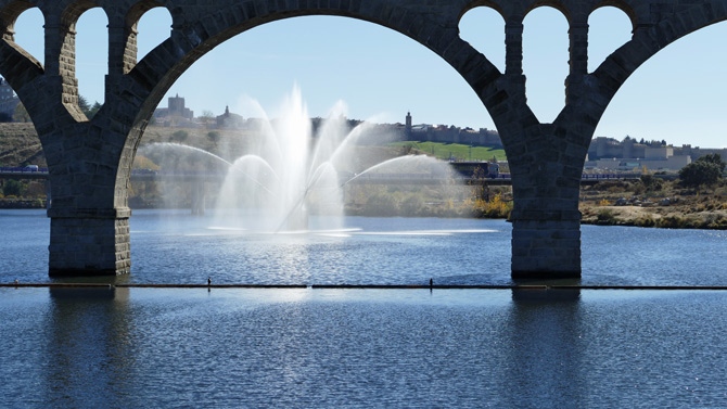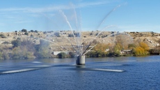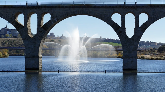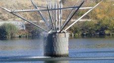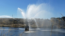 El sistema de aspersión ofrece una llamativa vista cual si una fuerte ornamental se tratase, si bien en realidad su misión es la de aportar oxígeno al agua del embalse.