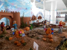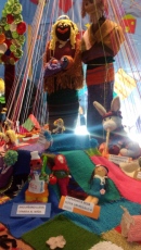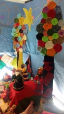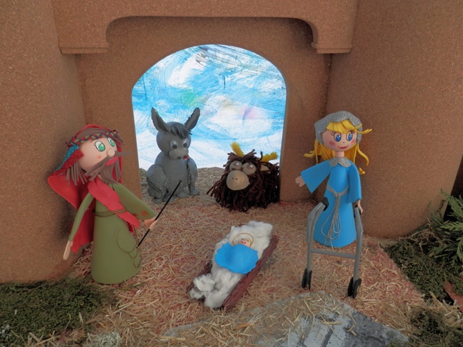 Todas las figuras están hechas de lana, y San José, la Virgen y el niño -de color azul- de tamaño natural, y se encuentran entre personajes de cuento, situándose sobre una gran alfombra también de lana. Calculan haber empleado más de 300 ovillos.