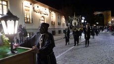 La comitiva ha hecho un alto en la ermita del Humilladero al paso de La Soledad, momento en el que el párroco de San Pedro, Diego Martín Peñas, dirigió una oración.