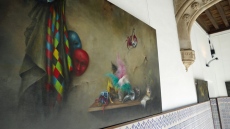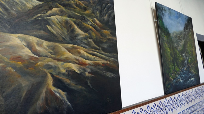 El patio del torreón es el espacio en el que desde este martes se puede ver ‘Renacer’, una colección de 19 óleos sobre lienzo de Mercedes Poza, artista soriana -nacida en Berlanga de Duero- residente en Valladolid que se ha inspirado en Tiziano y Caravaggio para sus marinas y bodegones. También la pintura del siglo XVIII le ha llevado a presentar algunos paisajes en los que acaba imprimiendo claroscuros y pinceladas propias.