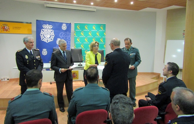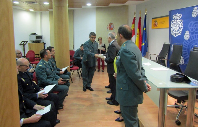 Los diplomas entregados por María Ángeles Ortega, subdelegada del Gobierno, y Francisco José Sánchez, delegado territorial de la Junta, además del comisario de Policía y teniente coronel de la Guardia Civil, son el reconocimiento a la labor de estos agentes durante el curso 2014-2015, cuando mantuvieron 202 charlas divulgativas.