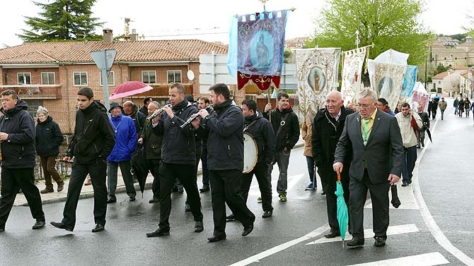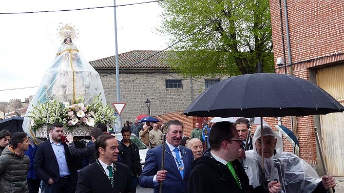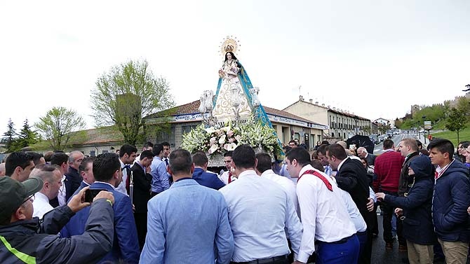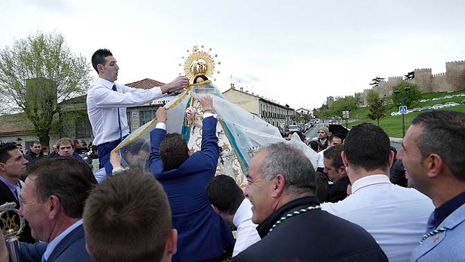 Óscar, David, Alberto y Álvaro han sido los porteadores de la imagen. "No me lo esperaba así esto es más grande de lo que yo creía", ha confesado un sudoroso Óscar en el puente Adaja tras cruzarse abrazos con familiares y compañeros. David mostraba su satisfacción porque el tiempo les había respetado la lluvia.