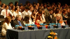 El coro ha cantado de nuevo, con el 'Adelante', de Nayara, antes de que subiera al escenario de Tuna de Magisterio, y que el coro clausurase el acto con el tradicional 'Gaudeamus igitur'.