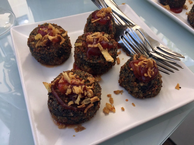 - 'Esfera crocante de queso artesano de cabra y vaca, con bacon, cebolla caramelizada, frutos rojos y reducción de mostaza y miel', del Restaurante La Bruja.