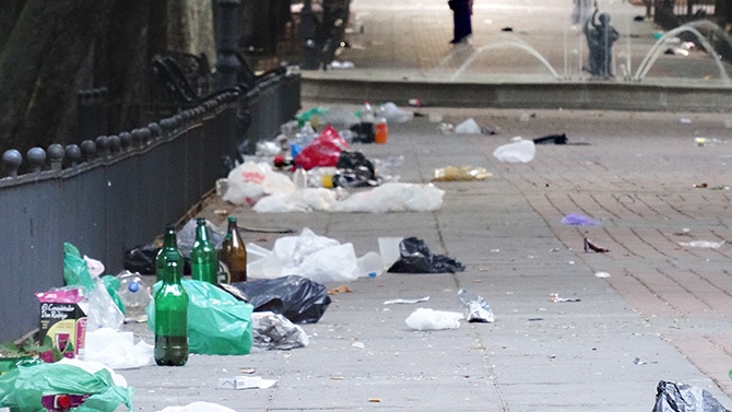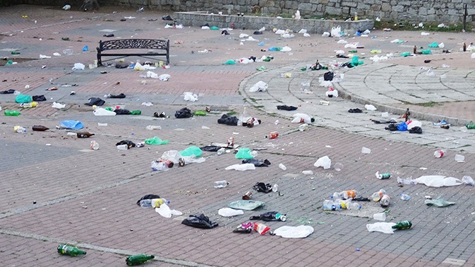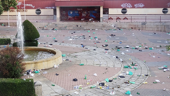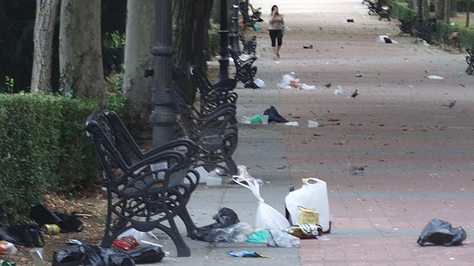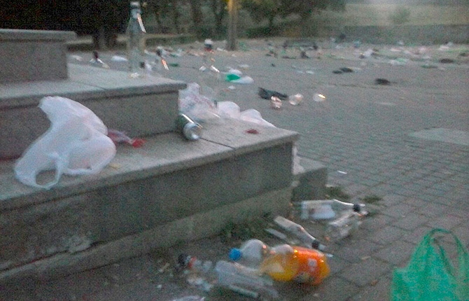 El hecho, advertido por un lector, deja ver los abundantes desperdicios en la mañana del sábado, que no comenzaron a recogerse hasta las 10,15 horas.