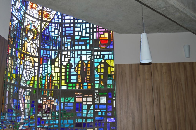 El suelo cuenta con diferentes texturas para que las personas ciegas reconozcan las zonas de bancos, el pasillo central y el altar.