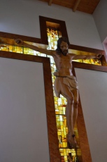 Al entrar en la iglesia se ve una gran cruz luminosa de la que pende un Cristo de tres metros de altura, al que acompaña en el presbiterio una talla de la Virgen con el Niño en brazos.