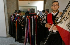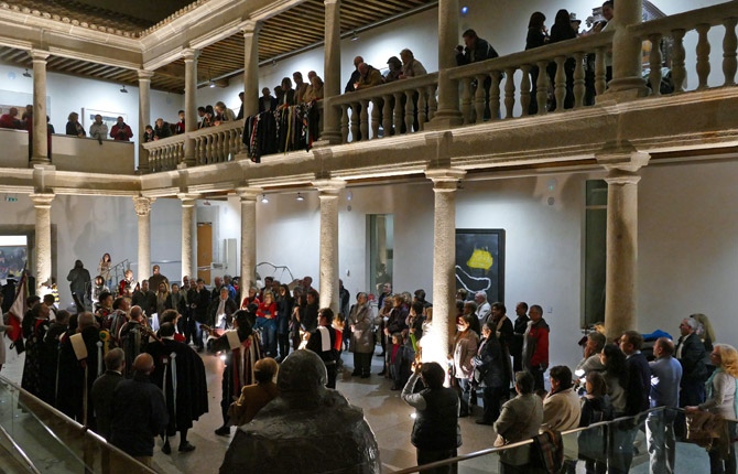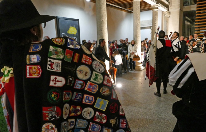 El Palacio de los Serrano ha sido escenario el viernes de la 'Ronda del balcón', la primera parte del XXXI Certamen Nacional de Tunas de Magisterio, que reúne a más de 200 tunos. Con sus instrumentos habituales y con otros más novedosos, puesto que algunas formaciones llevan violonchelo o congas.
