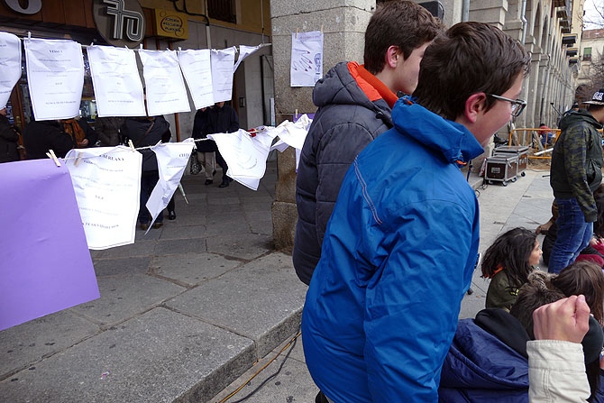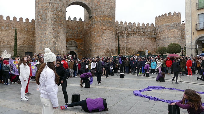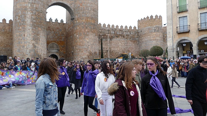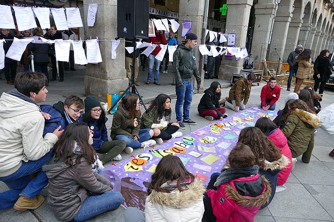Medio centenar de alumnos del IES Isabel de Castilla han escenificado una performance bajo la dirección de Pilar Rodríguez, que ha podido verse en el Mercado Grande tras la lectura de un manifiesto por parte del alcalde José Luis Rivas.