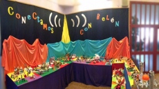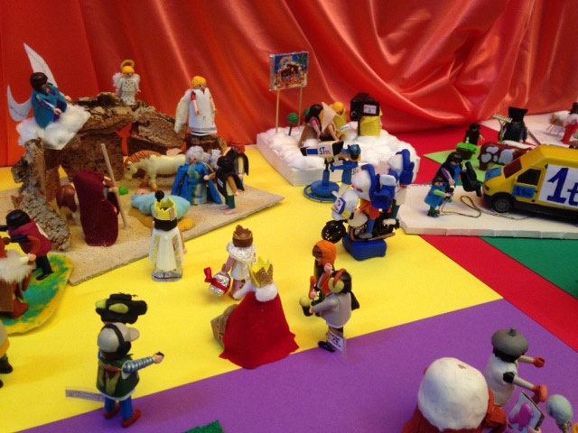 Padres e hijos han realizado las figuras tomando como base los juguetes Playmobil, y han tenido que decorarlas y enriquecerlas de forma creativa para adaptarlas a la idea, expuesta en el vestíbulo del colegio bajo el título de 'Conectamos con Belén'.