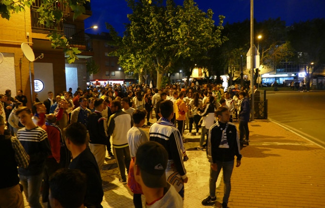 Los aficionados se han quedado en las aceras, sobre todo en la más próximas a los bares de la plaza, y sólo algún grupo se ha animado a acercarse y dar la vuelta la fuente entonando cánticos madridistas y tirando algunos petardos.