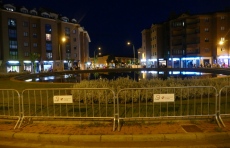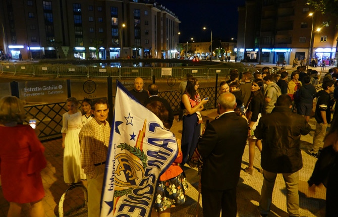 La fuente se encontraba rodeada y con carteles de prohibición para acceder a ella. Más de 300 personas, mucho de ellos niños y algunos vestidos del blanco de primera comunión, han acudido a la plaza nada más terminar el partido contra el Málaga.