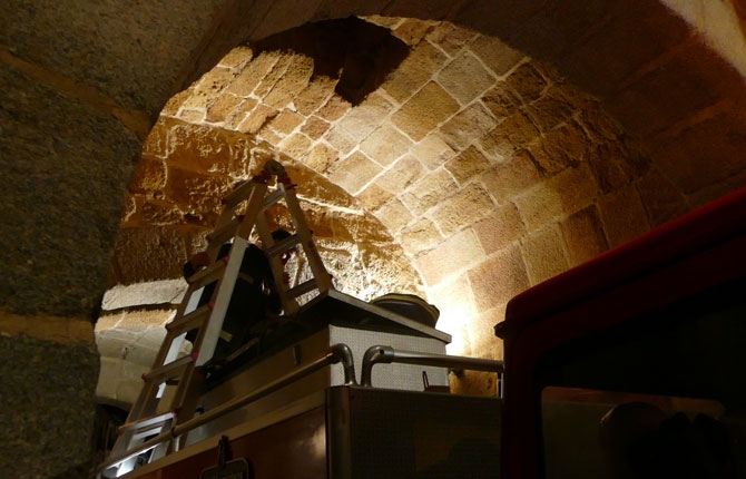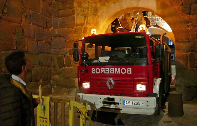 Los bomberos han acudido al monumento pasada la medianoche para revisar su estado, para lo que han introducido un camión bajo el arco de cara a comprobar el estado de la muralla y que no podían producirse más desprendimientos.