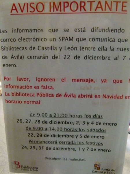 Muchos usuarios a los que había llegado el mensaje en los últimos días lo recibieron con fastidio, dado que las fechas vacacionales propician la utilización de los servicios bibliotecarios. Y sin mucho pensarlo, achacaron el cierre a los recortes en los servicios públicos, pero se trata de un mensaje de correo basura o spam, anónimo, enviado masivamente, y que anunciaba el cierre de todas las bibliotecas de Castilla y León entre el 22 de diciembre y el 7 de enero.