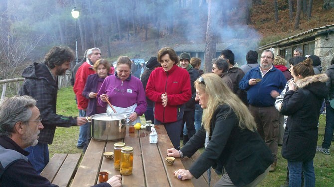 Como postres degustaron tarta de queso, brownie de chocolate, higos secos y kiwis aportados por la Asociación Cultural La Risquera, regado con un tempranillo joven producido en San Esteban del Valle por Avelino, para terminar con una queimada, aguardiente de higos y castañas asadas.