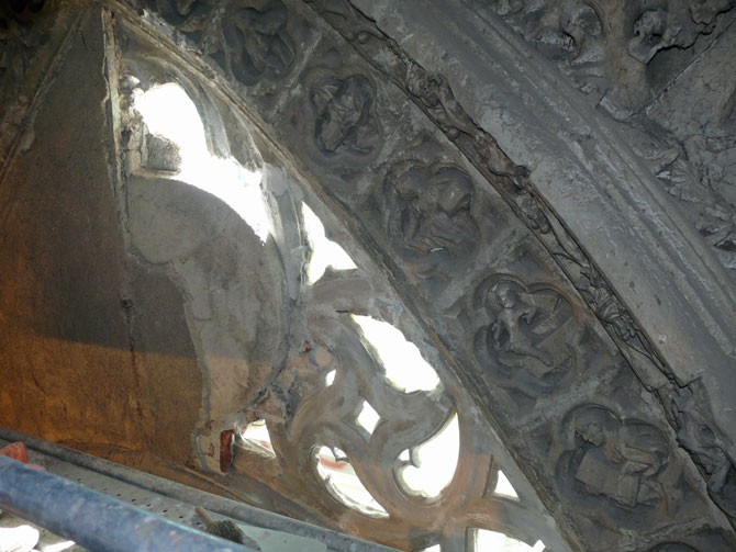 “El alarmante deterioro de las esculturas y elementos decorativos de la portada y el evidente riesgo de desprendimiento de fragmentos y caída a la vía, con peligro para las personas”, hicieron necesario incorporar al estudio petrológico una intervención preventiva, que incrementó en un 30 por ciento su coste, para bajar las tallas, consolidarlas e instalar una malla protectora que evita cualquier accidente y también impide la entrada de aves.