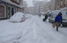 La intensa nevada deja peatones circulando por mitad de la calzada en las calles que son practicables para vehículos, que son las principales, mientras que en los jardines muchas ramas de árboles por efecto de la nieve. El tráfico de vehículos es escaso.