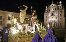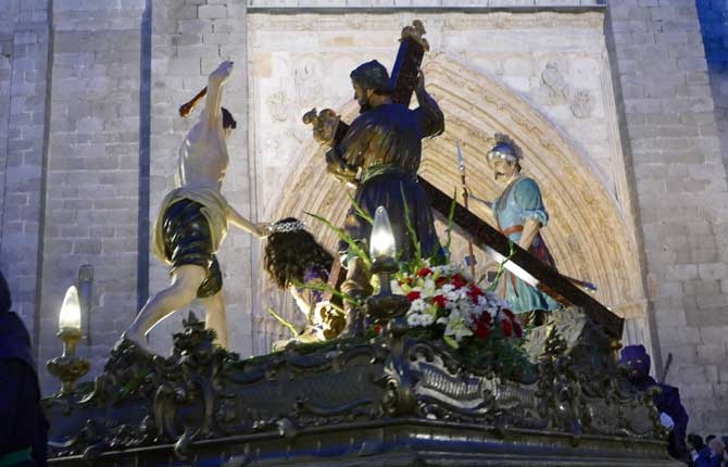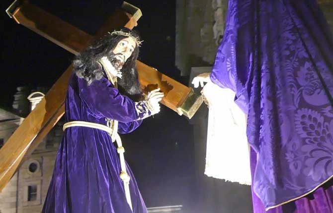 El desfile procesional narra, como el tono didáctico que impuso una época, la historia de la Pasión a través de nueve pasos.