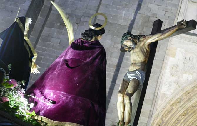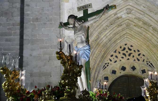 La austeridad de la desnuda Santa Vera Cruz abre una procesión con imágenes, la mayoría de comienzos del siglo XX, como son la última cena, la oración en el huerto, el prendimiento, Cristo amarrado a la columna, la caída santa faz, la tercera palabra y, por fin, el Cristo de los Ajusticiados, del siglo XVI.