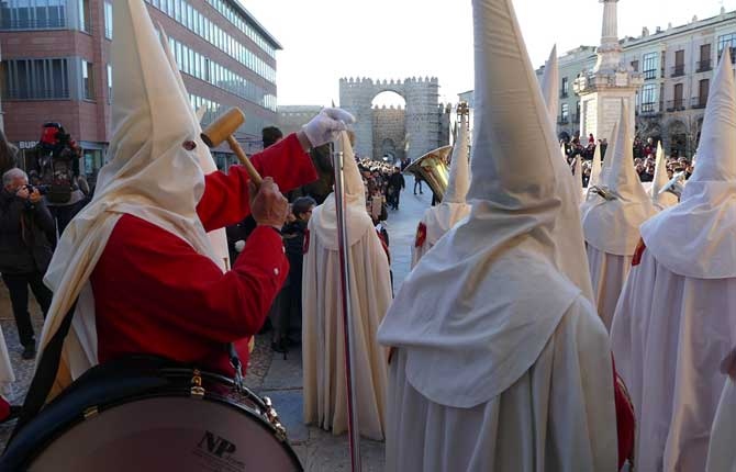 El sonido del desfile procesional, a juego con el luto que marca la comitiva, ha corrido a cargo de las bandas de cornetas y tambores Oración en el Huerto, y la del Amarrado a la Columna, llegadas desde la localidad vallisoletana de Medina del Campo.