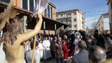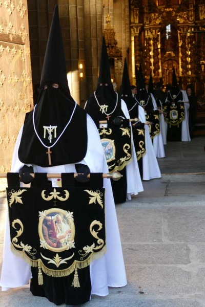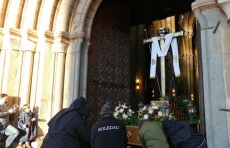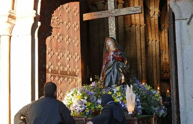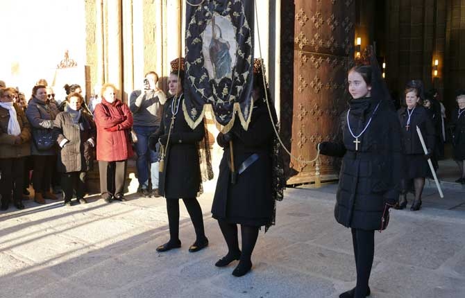Sin amenaza de lluvia, con sol y frío, la Procesión de la Soledad ha salido de la iglesia de San Pedro con las damas de riguroso luto con mantilla española, entre las imágenes de Nuestra Señora de la Soledad, y primero, la Santa Cruz.