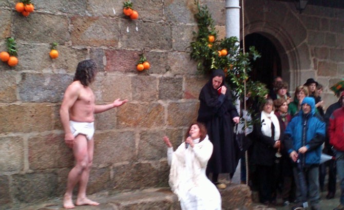 La representación, titulada ‘In oculis portabunt te (En los ojos te llevarán)’ y de un cuarto de hora de duración, ha contado la historia del santo y simboliza la llegada de la luz, del crecimiento de los días y la cercanía de la primavera en un auto redactado por el animador a la lectura Martín Nebras, mayordomo de honor vitalicio encarnado en su alter ego cristiano bajo el nombre de Gaudentius Podii.