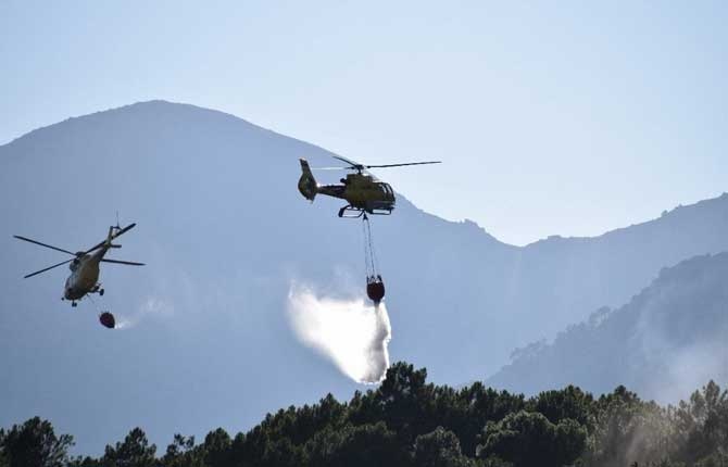 En el fuego trabajan un técnico, cinco agentes medioambientales, tres cuadrillas de tierra, seis autobombas, seis cuadrillas de Especialistas en Lucha contra Incendios Forestales (ELIF), nueve helicópteros -dos de ellos de coordinación- y otros dos helicópteros de la vecina Comunidad de Madrid.