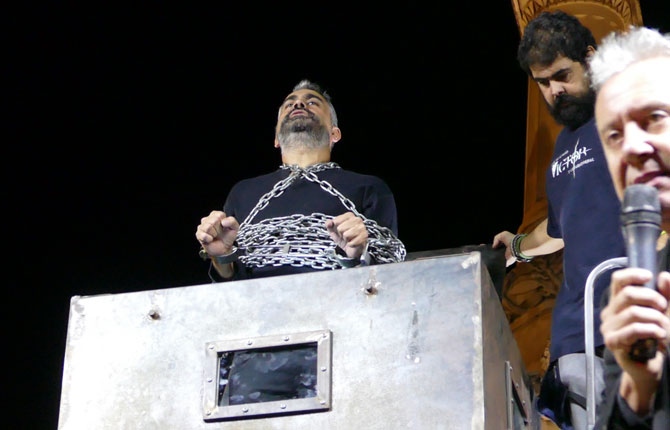 Dentro del cubículo ha permanecido más de un cuarto de hora, hasta que se ha desenmarañado de las cadenas, ha roto una pequeña ventana y ha sacado la mano para recoger una ganzúa colocada encima del horno. Con ella ha abierto los candados de la caja metálica y ha salido para, lo primero, refrescarse con un cubo de agua ante el aplauso de los espectadores.