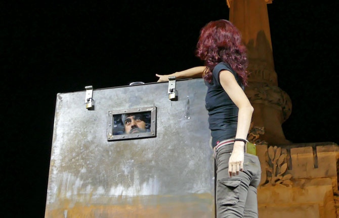 ‘Celsius’ ha sido el espectáculo de magia más llamativo de la primera jornada del festival. Encadenado y candado se ha metido en un horno, alimentado por varios quemadores. La temperatura medida en el exterior ha alcanzado los 210 grados mientras que un móvil y a través de Facebook se podía ver su cara de incluso conversaba con sus seguidores.