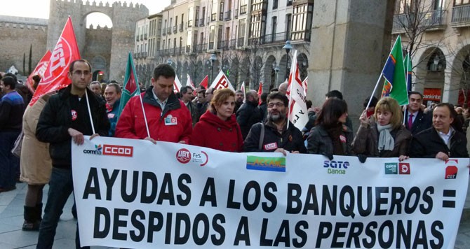 Tras la concentración frente a la antigua sede de Caja de Ávila, la protesta acudió hasta la plaza de Santa Ana, tras un alto ante la oficina principal de Caja Duero-España, entidad que sufrirá en breve un expediente de regulación de empleo.