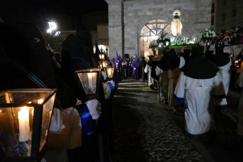 Las túnicas moradas con capas de color oro lucieron con ligero viento en la noche del Martes Santo, cuando la procesión de Medinaceli partió a las 21 horas de la Catedral, adonde llegó cerca de la medianoche, acompaña de las bandas de la Santísima Trinidad de Palencia y Jesús Atado a la Columna de Medina del Campo.