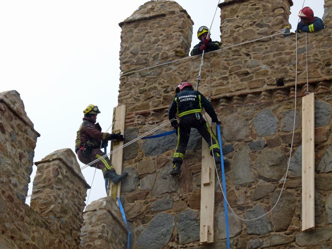 En un laborioso ejercicio práctico de estabilización de edificios en seísmos, los bomberos procedieron a cinchar el cubo número 12 -el primero del lienzo norte desde San Vicente- colocando primero tablones -cortados a la medida allí mismo- alrededor de él, en un trabajo que duró varias horas, desde poco antes de las 13 horas hasta el anochecer.