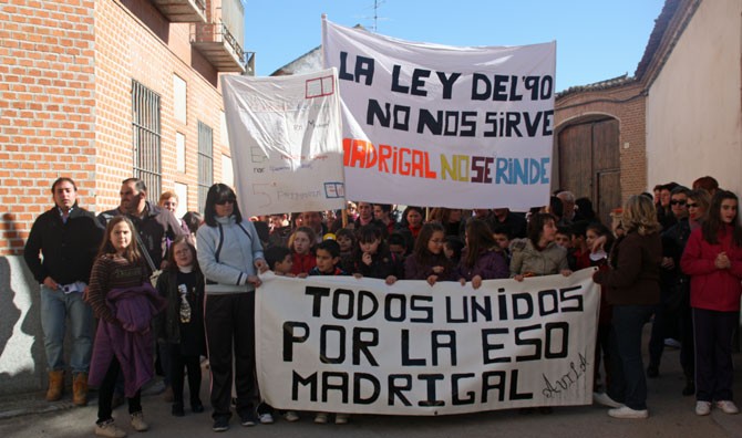 ‘Todos unidos por la ESO’ o ‘La ley del 90 no nos sirve, Madrigal no se rinde’ fueron algunas de las pancartas que pudieron verse en las calles de la localidad el viernes por la tarde, en un recorrido que partió y terminó frente al Colegio Reyes Católicos, haciendo un alto en el arco de Cantalapiedra, donde se leyó un manifiesto y varios padres explicaron los motivos por los que no quieren que sus hijos estudien en Arévalo.